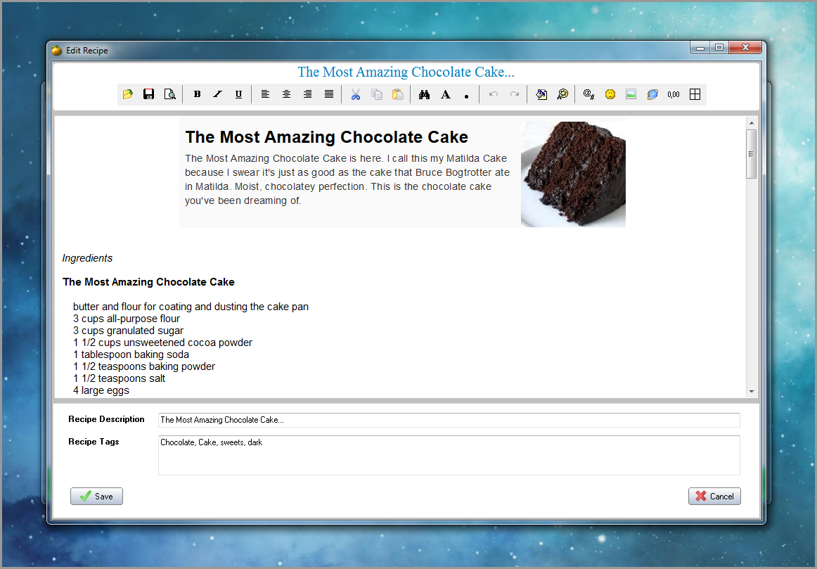 Recipes are entered or modified by using the full featured built-in text editor. One can also import recipes or text from TXT and RTF files. Drag and drop is also supported directly from any other application or web browser.